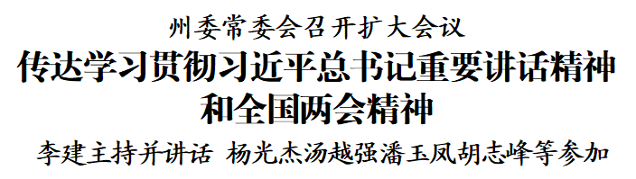 3月14日,州委常委会召开扩大会议,传达学习习近平总书记在全国两会期间重要讲话精神和全国两会精神,贯彻落实全省领导干部会议精神,研究部署农村改革、新时代审判、公务接待管理等工作。