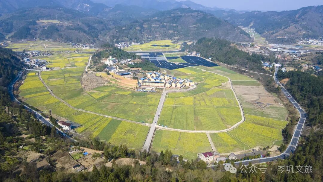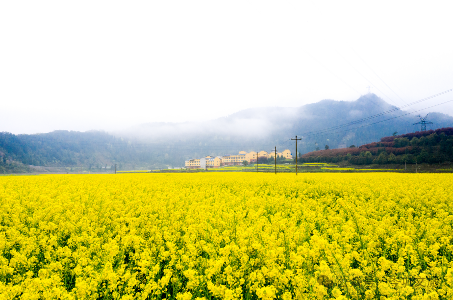 蓝天白云下的油菜花海,背景是一排一排的小房子,金灿灿的油菜花海与天空、丛林、村舍,构成了一幅宁静平和的优美画卷。