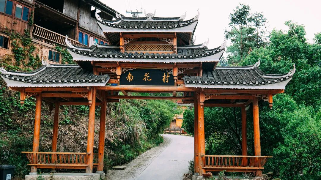 村寨依山而建,吊脚楼层层叠叠,鳞次栉比,掩映在苍松翠竹之中,全村森林覆盖率83.2%。沿着鹅卵石铺砌古巷道,漫步在寨子里,追寻南花苗寨的故事。