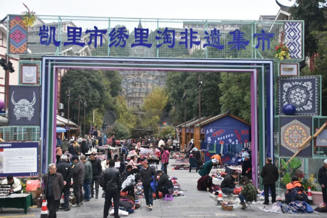 绣里淘非遗集市位于凯里苗侗风情园观东巷、观西巷、鱼东巷、鱼西巷等区域,于2023年9月22日正式开市。集市内汇集了省外、黔东南州内及周边县(市)的商户500余户,展示有新刺绣、老绣片、银饰等约6100多种产品,集市营业时间:每周三、四、五、六,8:00-17:00。