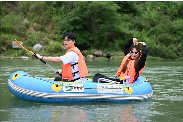 “爽爽漂”凯里清水江的漂流河道全长约 6km,路线是从凯里清水江普舍寨下游见义勇为广场至游方谷旁湖心岛及两岸碧绿的峡谷。