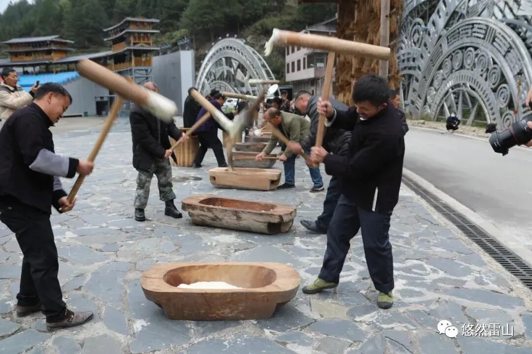 两人抡着特制的木锤搓打糍粑